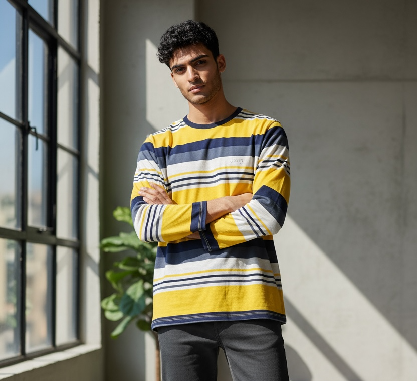 A soft, breathable summer T-shirt available in four colors—Yellow, Grey, Red, and Blue—with stylish multi-stripe design for a fresh casual look.